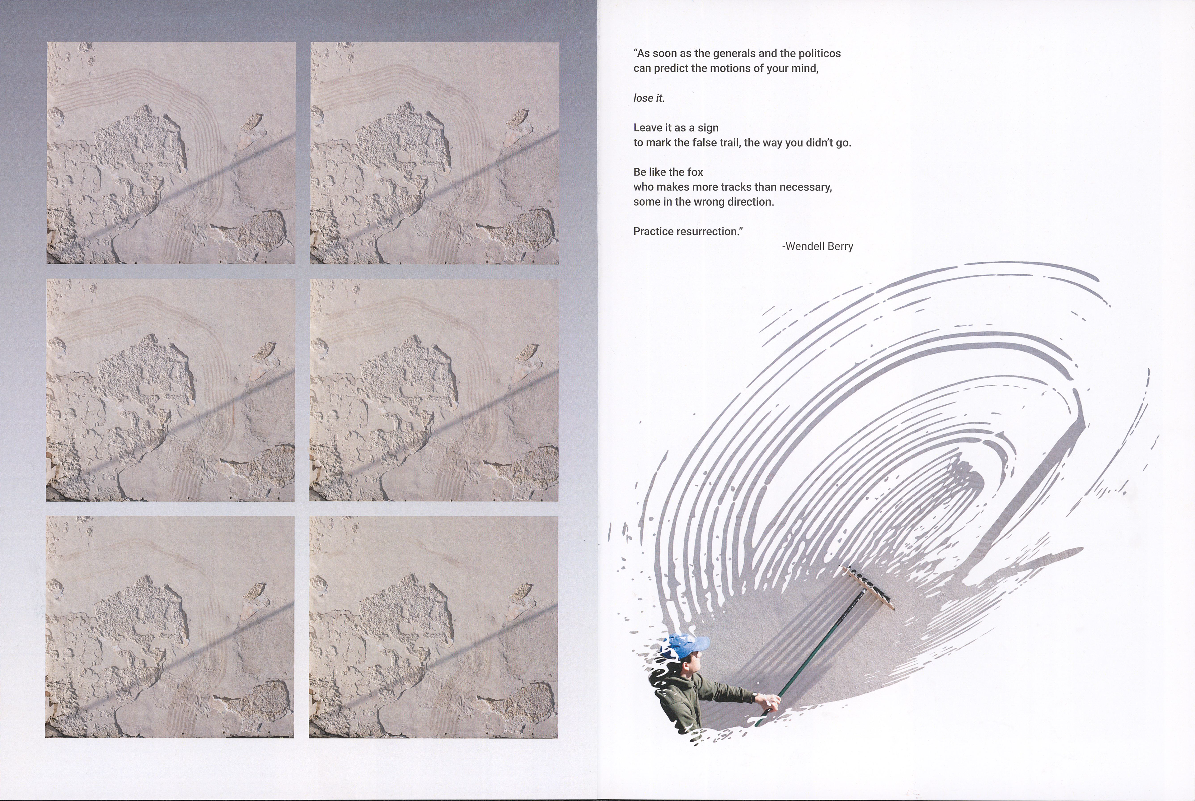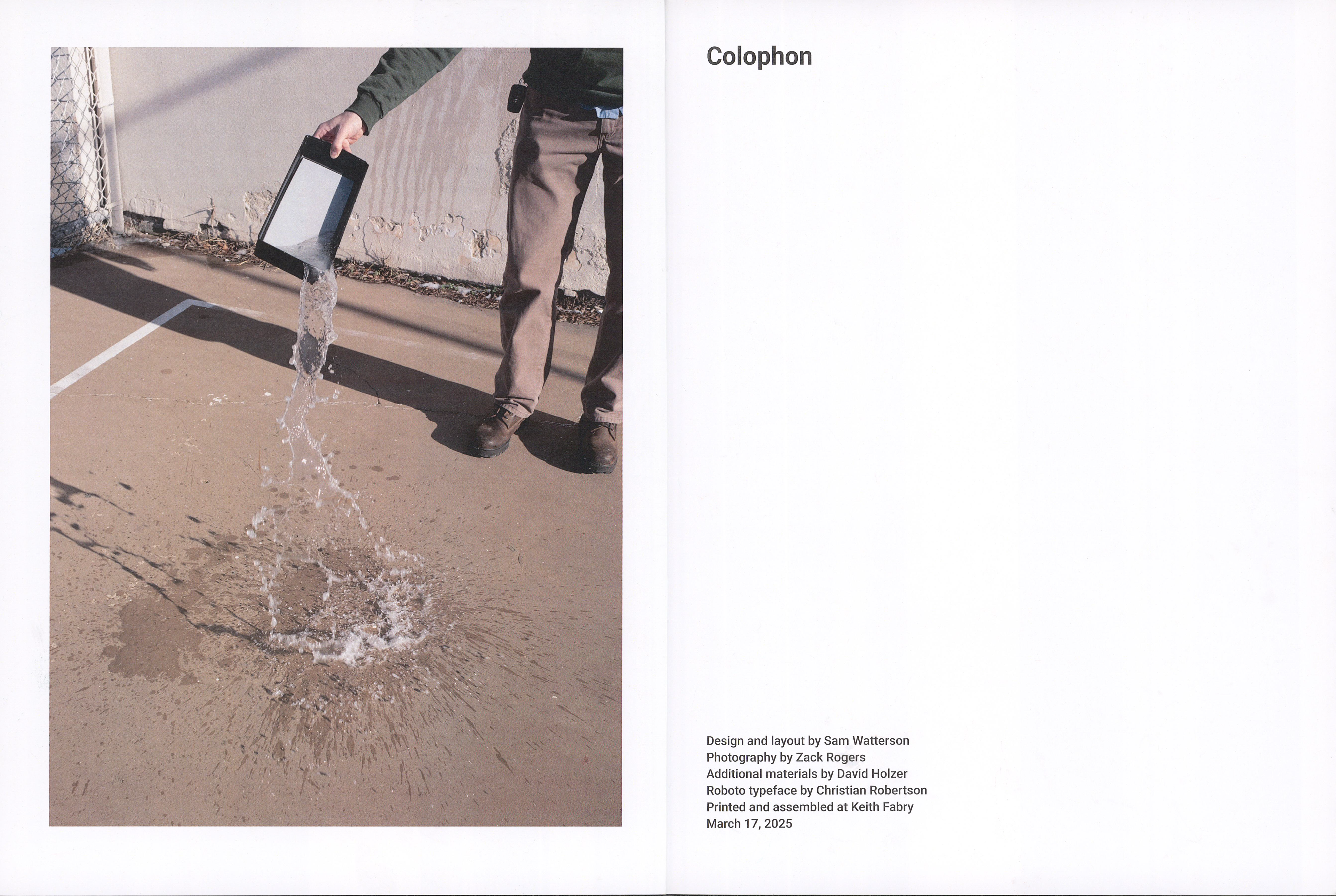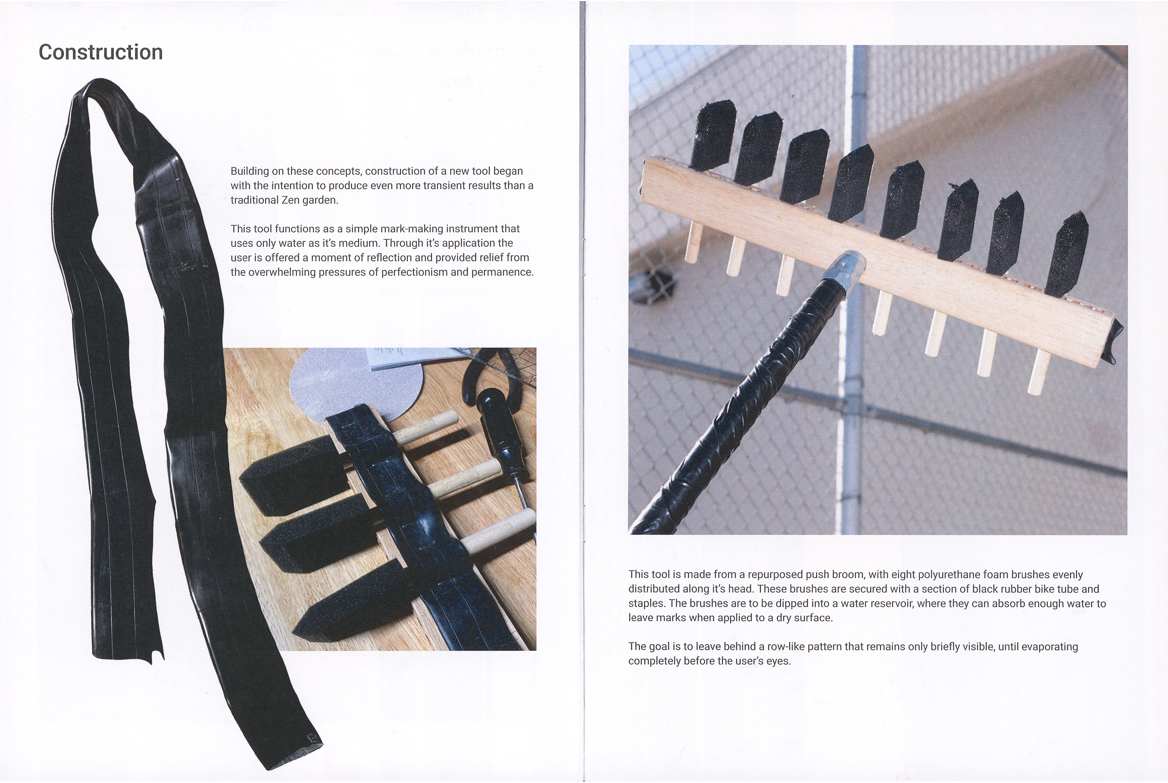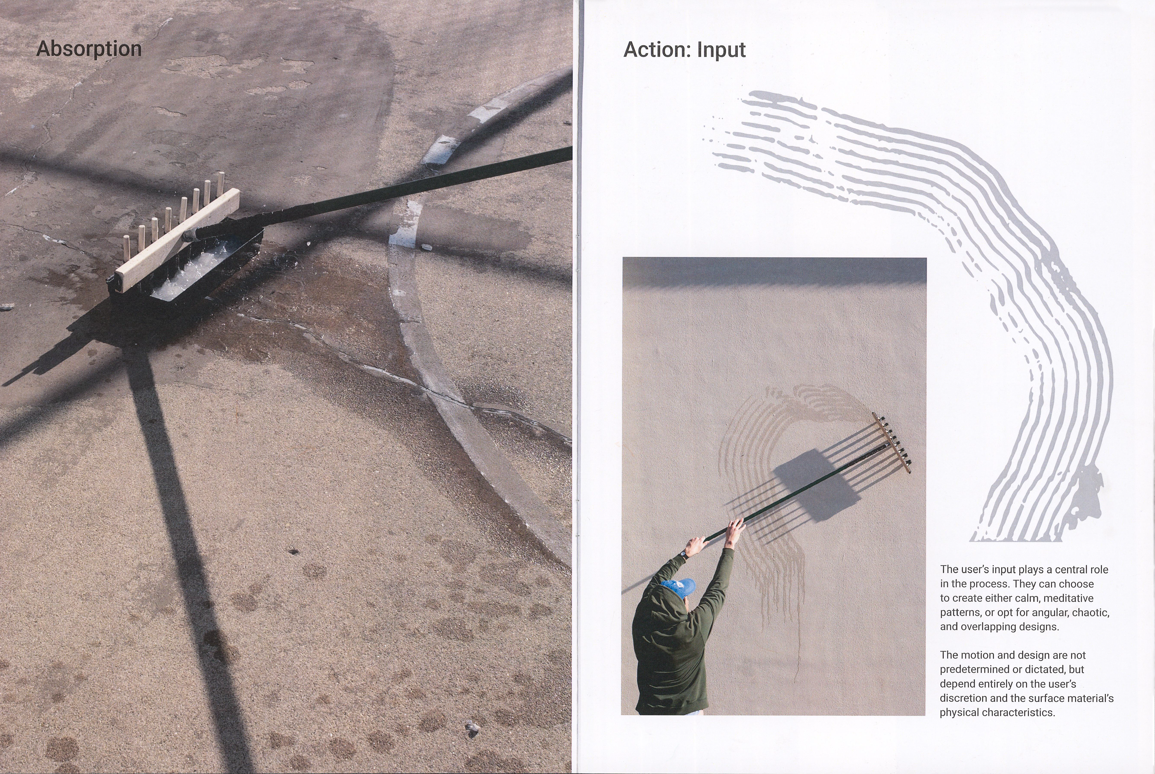 This magazine documents the construction and implementation of a translation machine that creates impermanent and fleeting marks made only from the application of water to a dry surface. Inspired by the teachings of Zen Buddhism, these marks progressively disappear, briefly freeing the user from the pressure and responsibility of legacy and perfectionism.