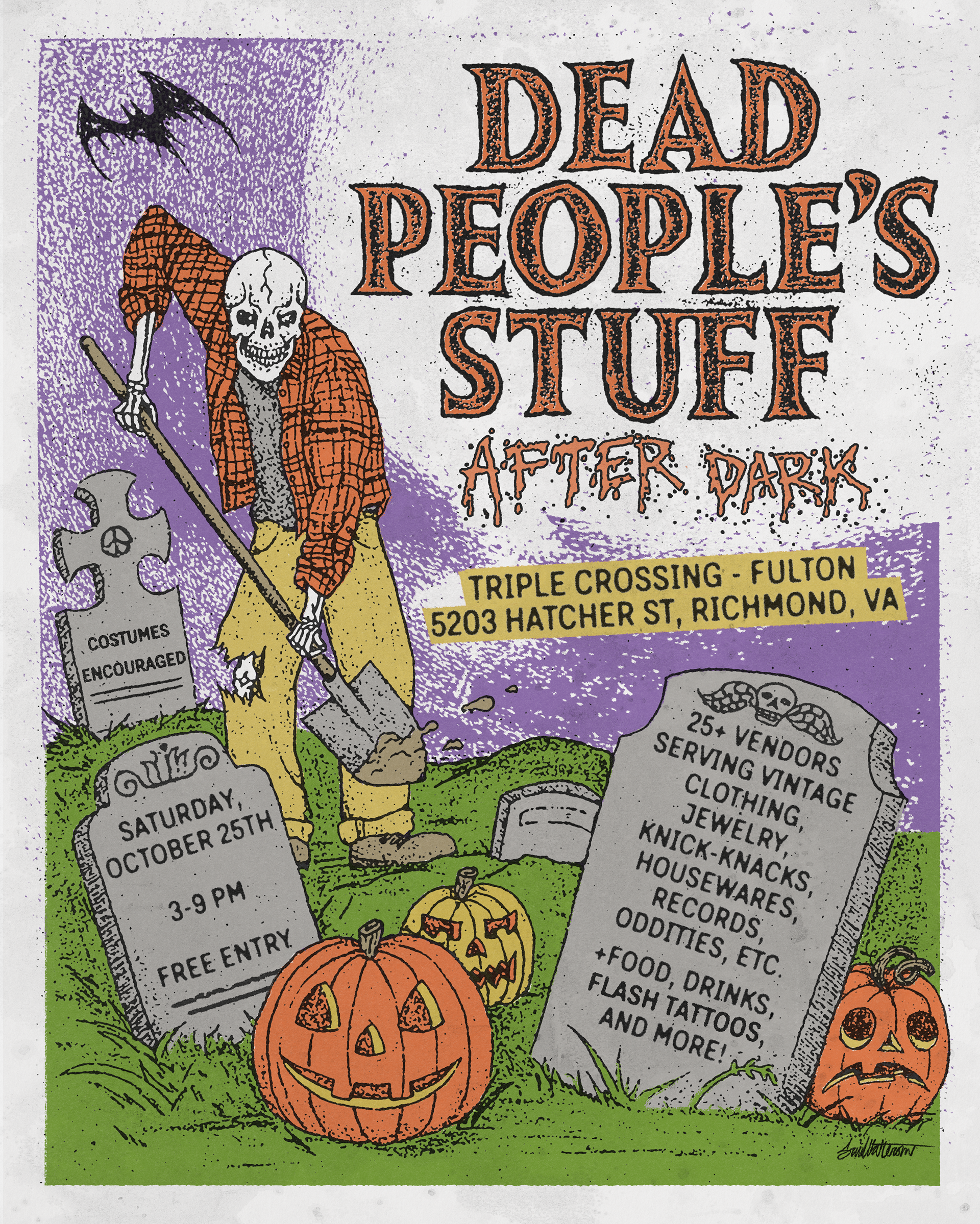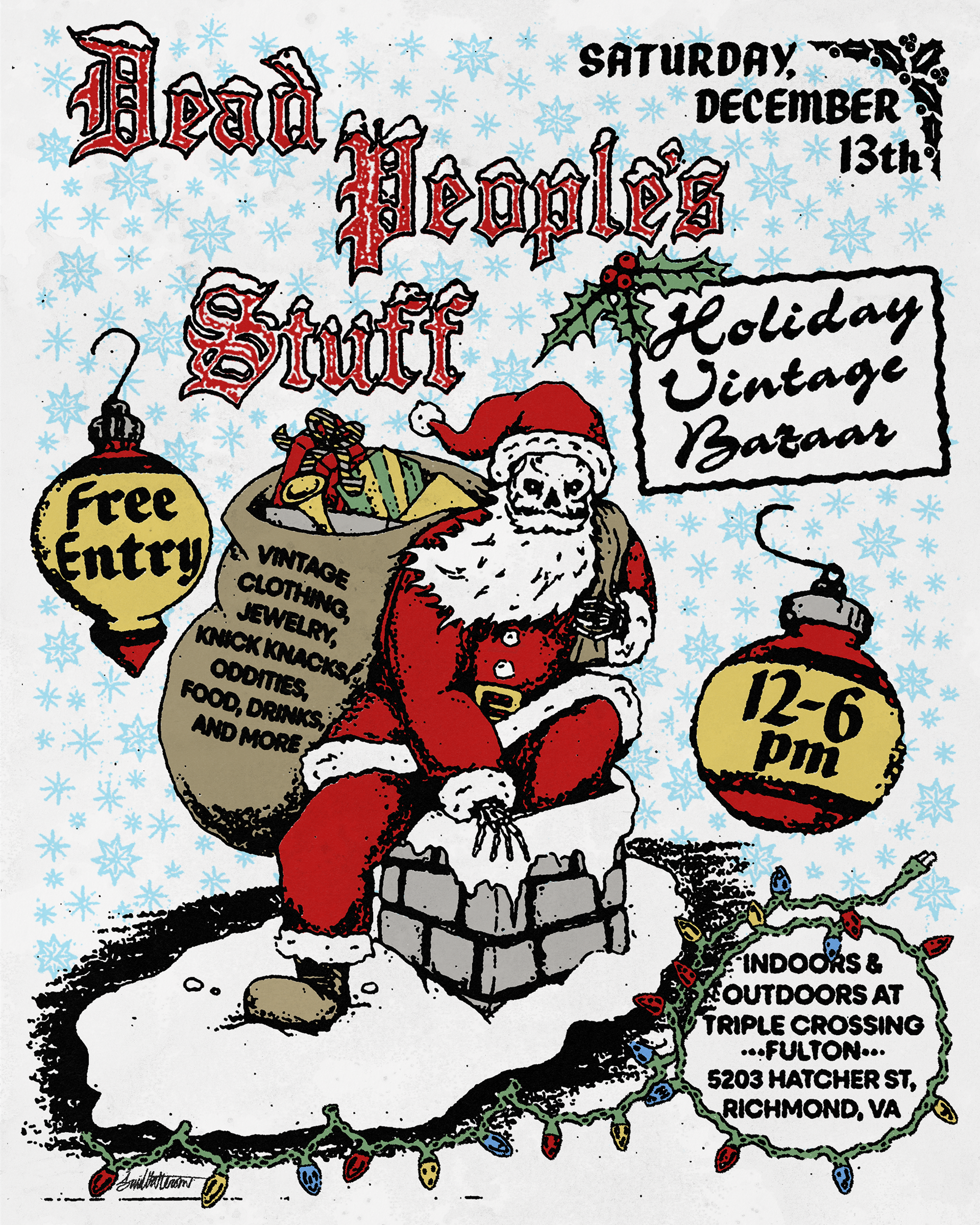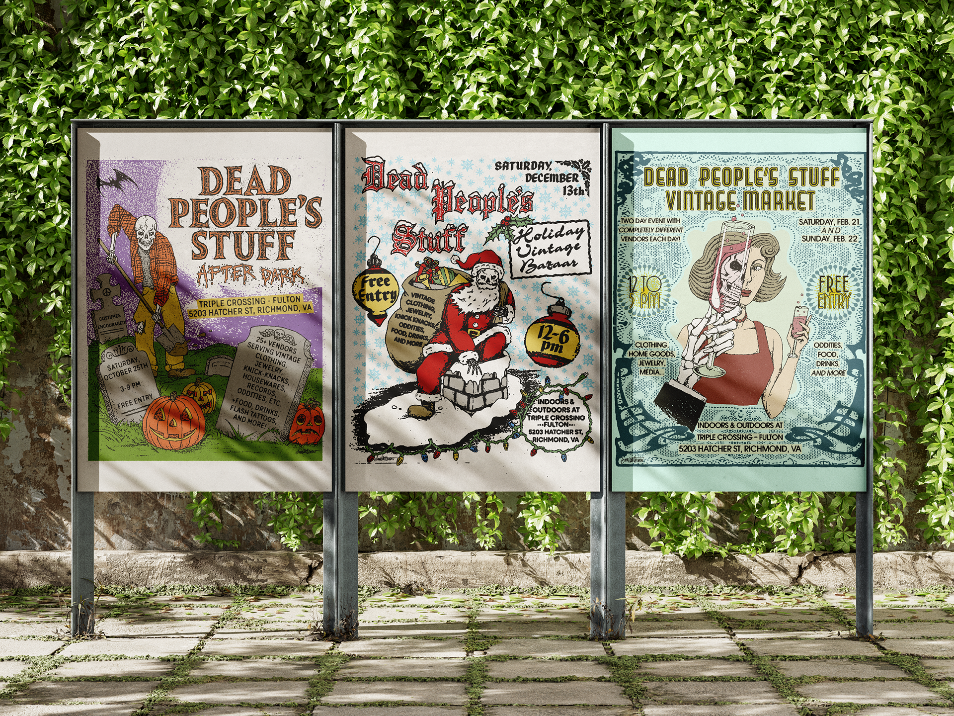 In September 2025, I began working for Dead People's Stuff Vintage Market, Richmond's premier vintage clothing retail organizers. Through close collaboration and trust with the promoters, I was able to deliver three distinct posters for their Halloween, Holidays, and New Years kickoff events, providing a visually cohesive aesthetic while increasing attendance and boosting sales for their vendors.