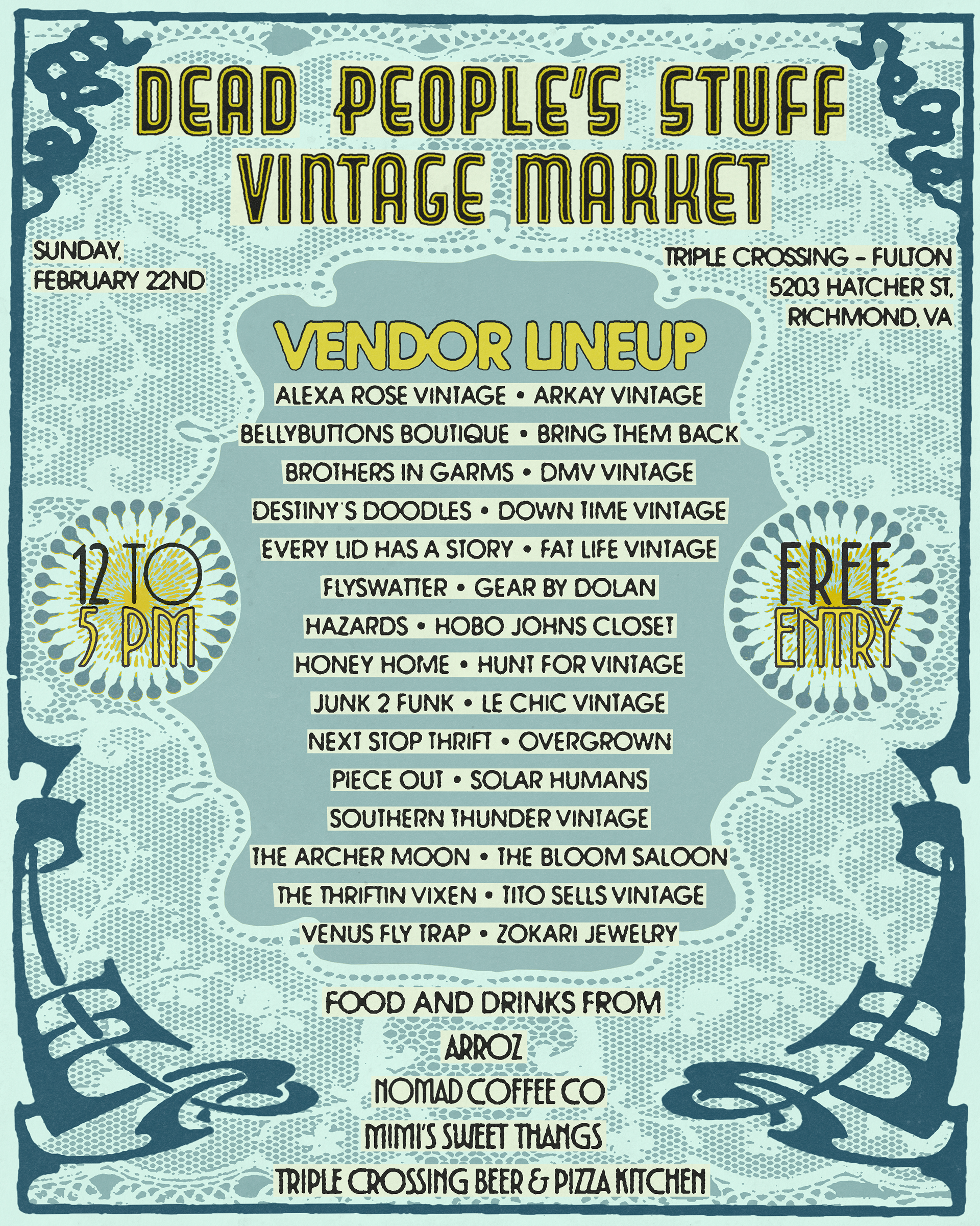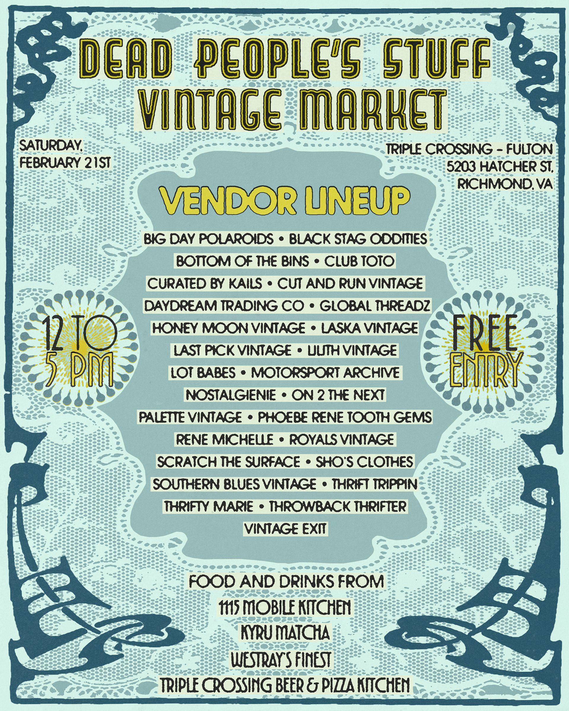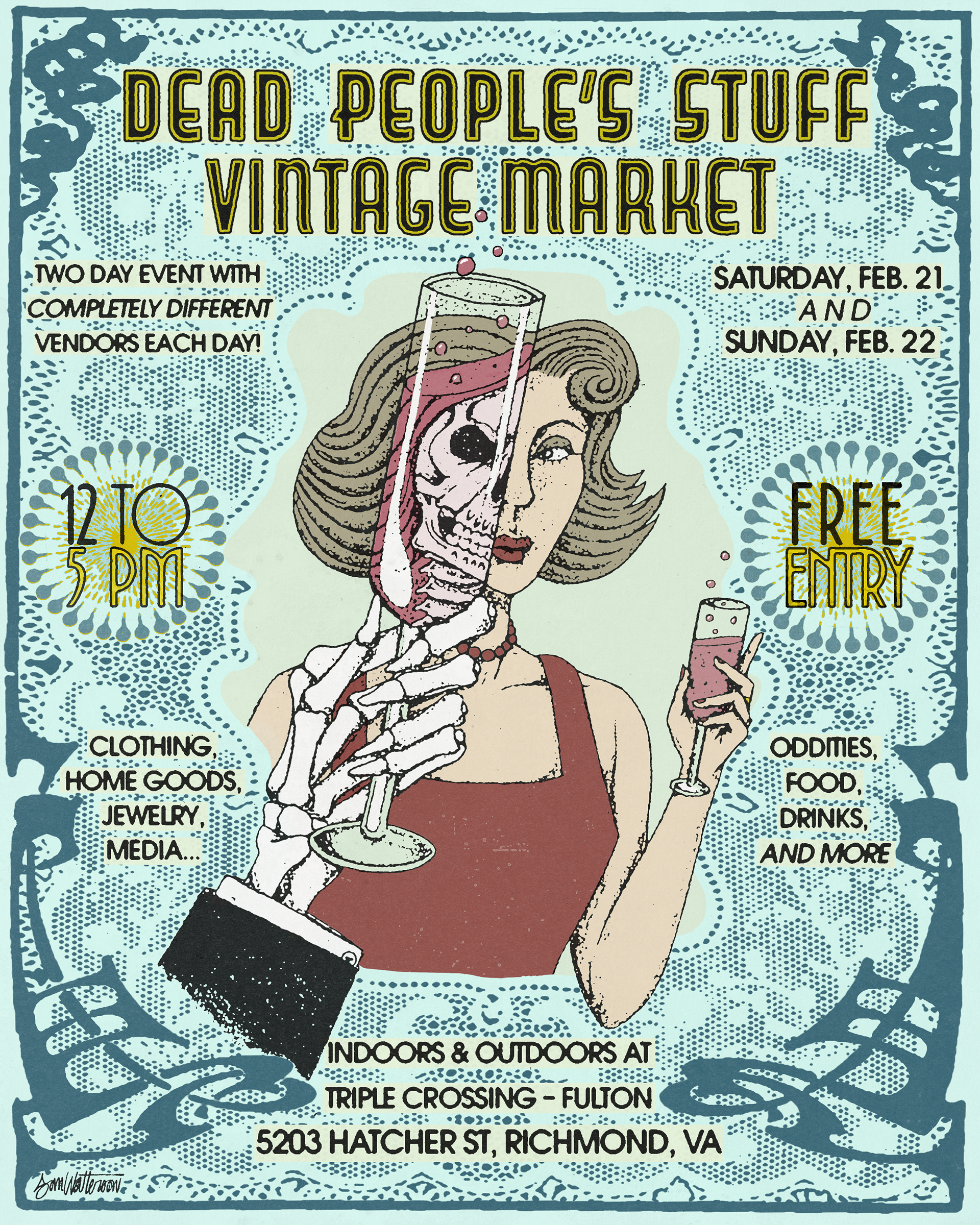 In September 2025, I began working for Dead People's Stuff Vintage Market, Richmond's premier vintage clothing retail organizers. Through close collaboration and trust with the promoters, I was able to deliver three distinct posters for their Halloween, Holidays, and New Years kickoff events, providing a visually cohesive aesthetic while increasing attendance and boosting sales for their vendors.
