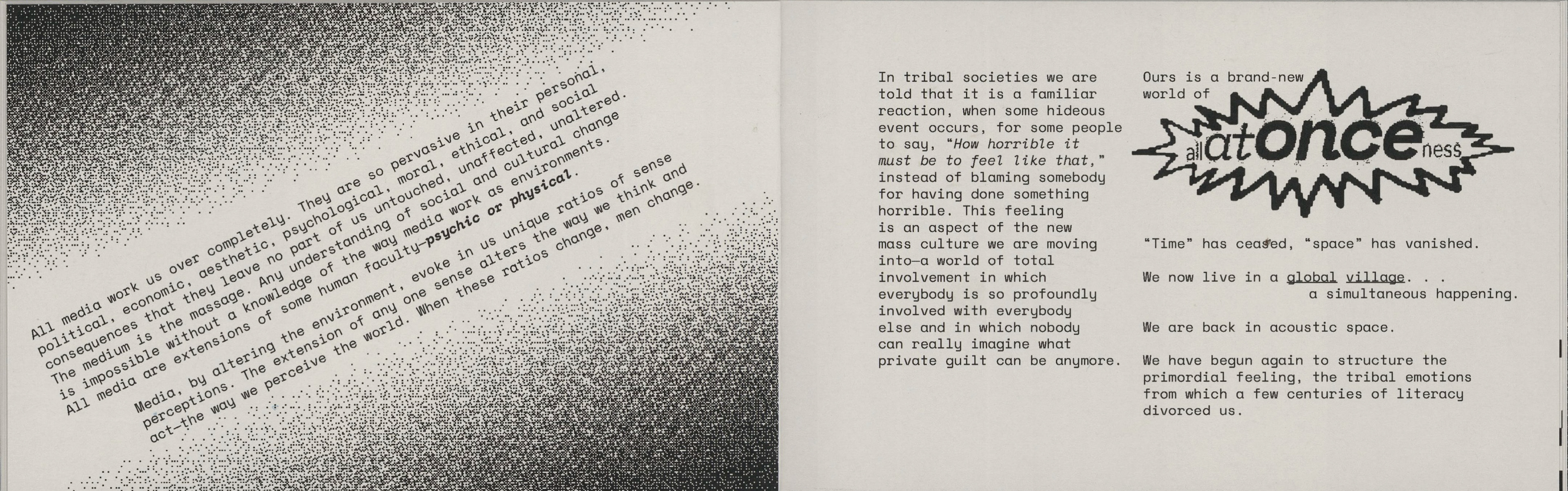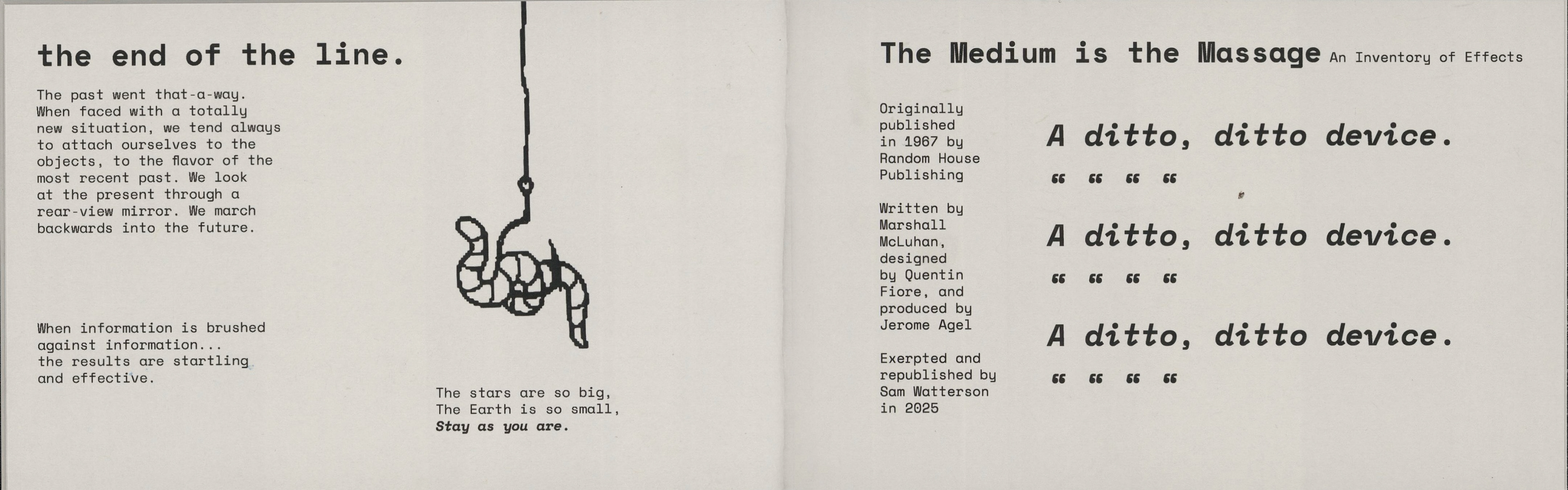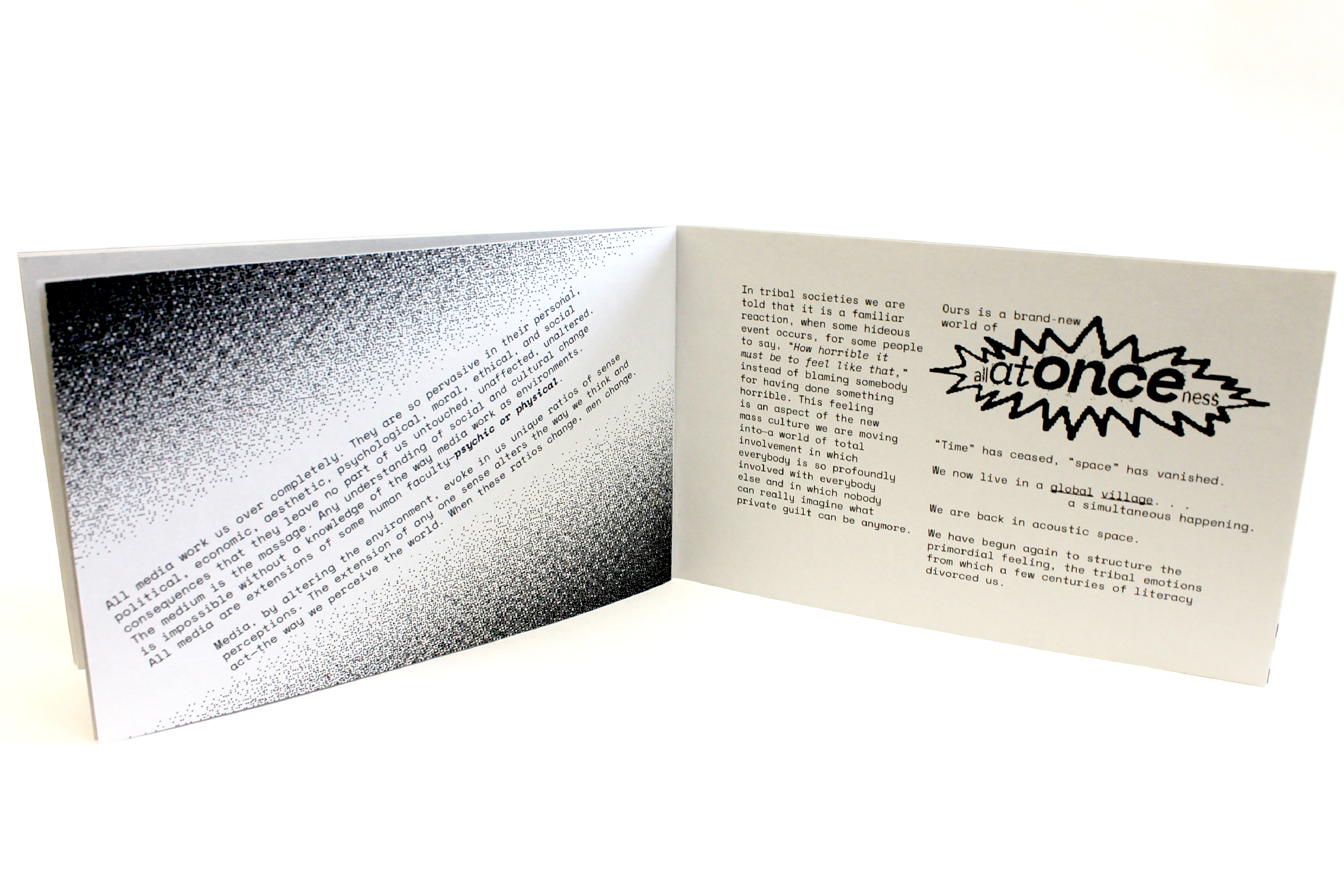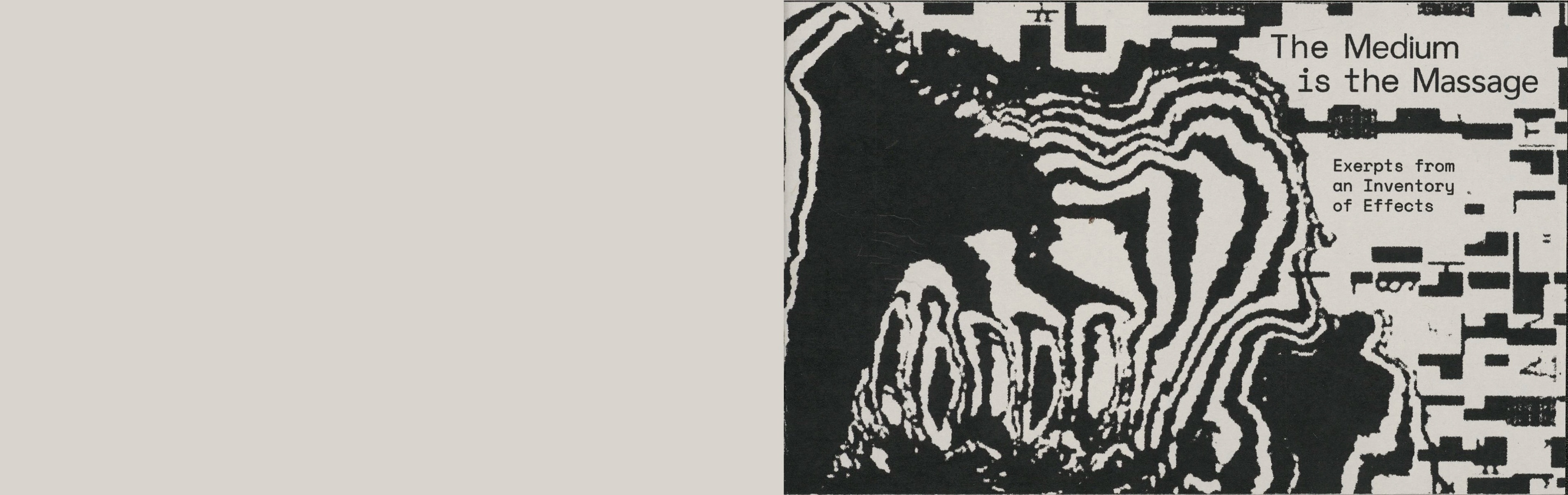 This project involved republishing excerpts of media analyst Marshall Mcluhan's seminal text "The Medium Is The Massage" in a contemporary, short form publication to be distributed to a new audience. The forced pixelation and screen-like format point to the technological changes that have occurred since the original work's release.