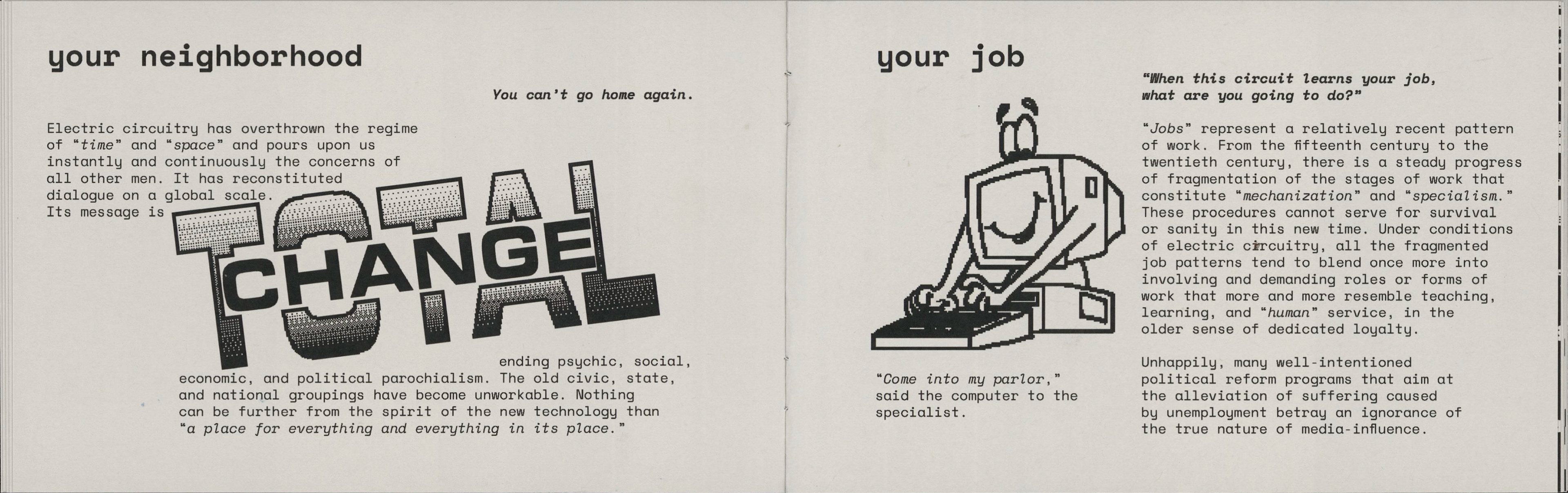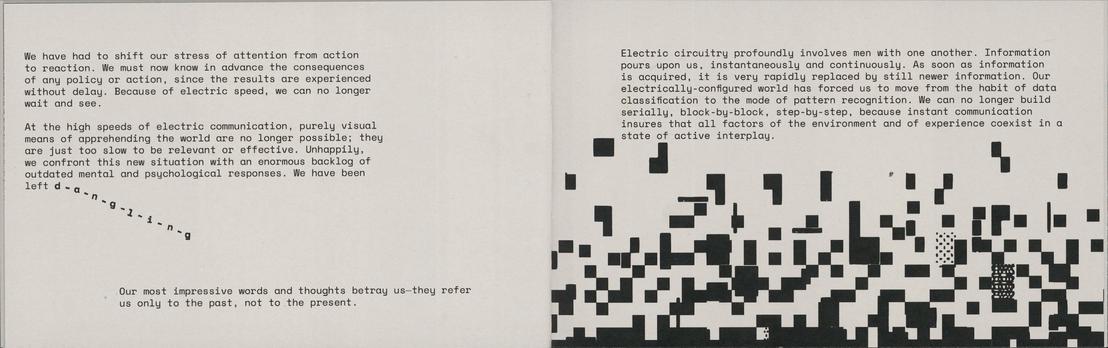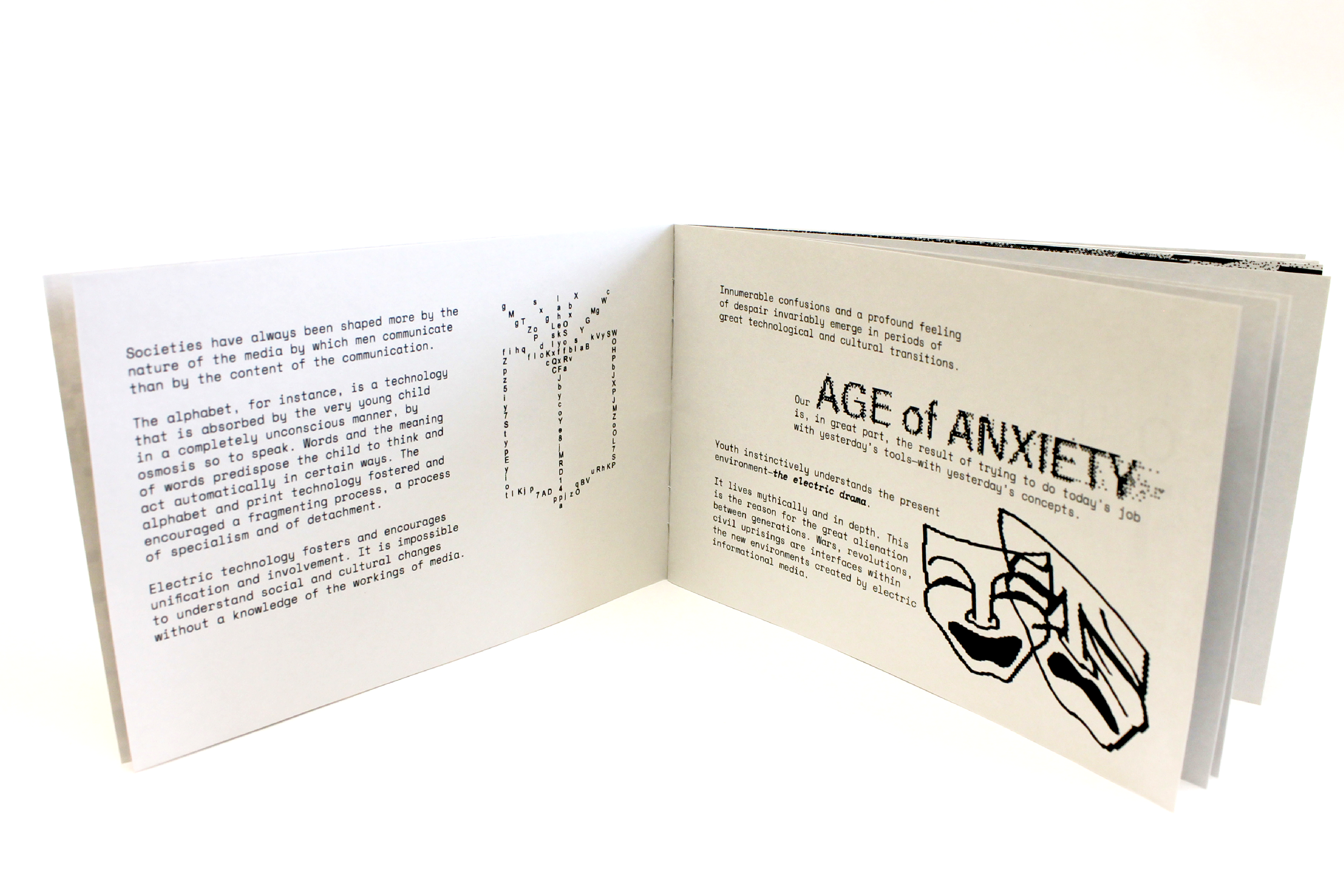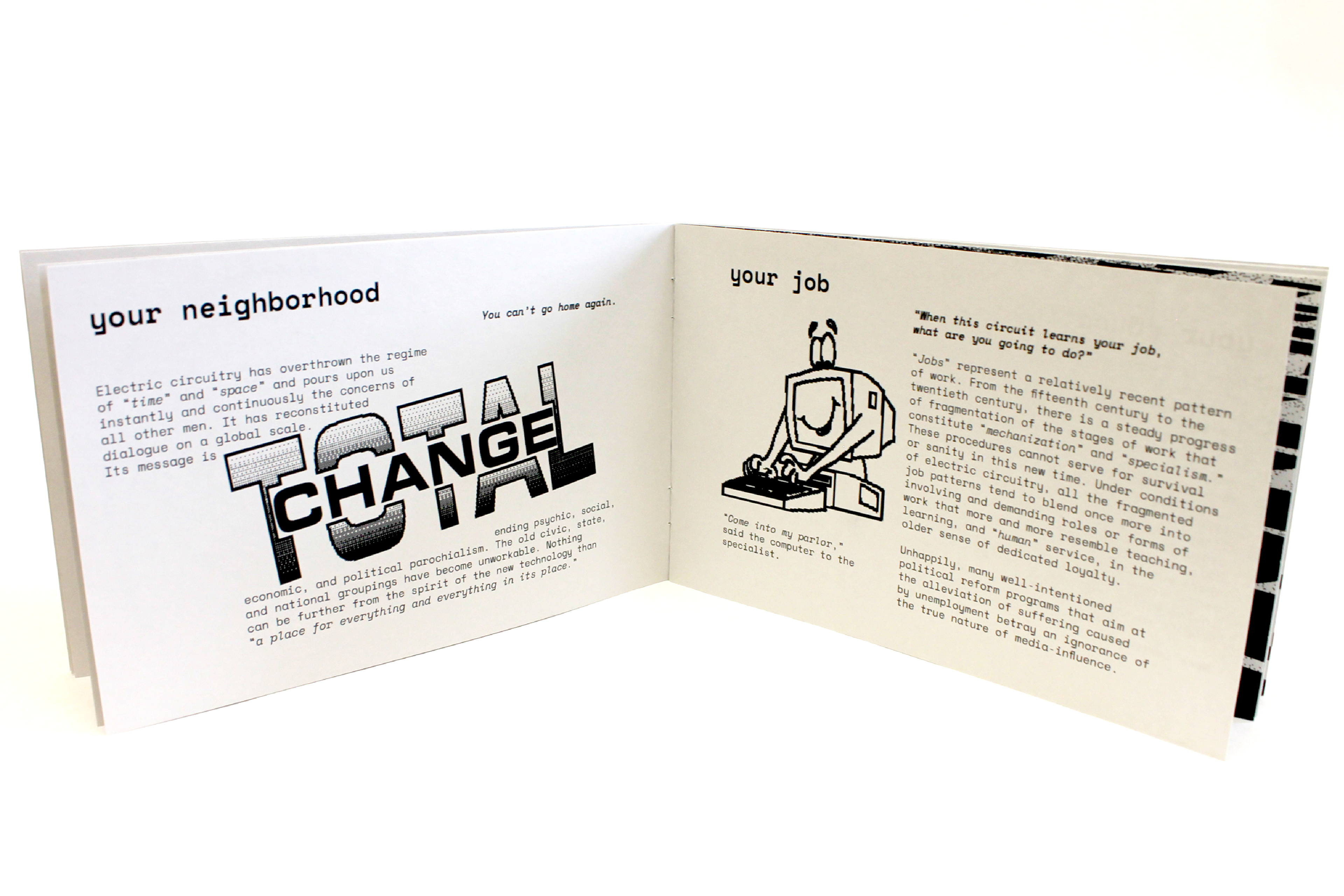 This project involved republishing excerpts of media analyst Marshall Mcluhan's seminal text "The Medium Is The Massage" in a contemporary, short form publication to be distributed to a new audience. The forced pixelation and screen-like format point to the technological changes that have occurred since the original work's release.
