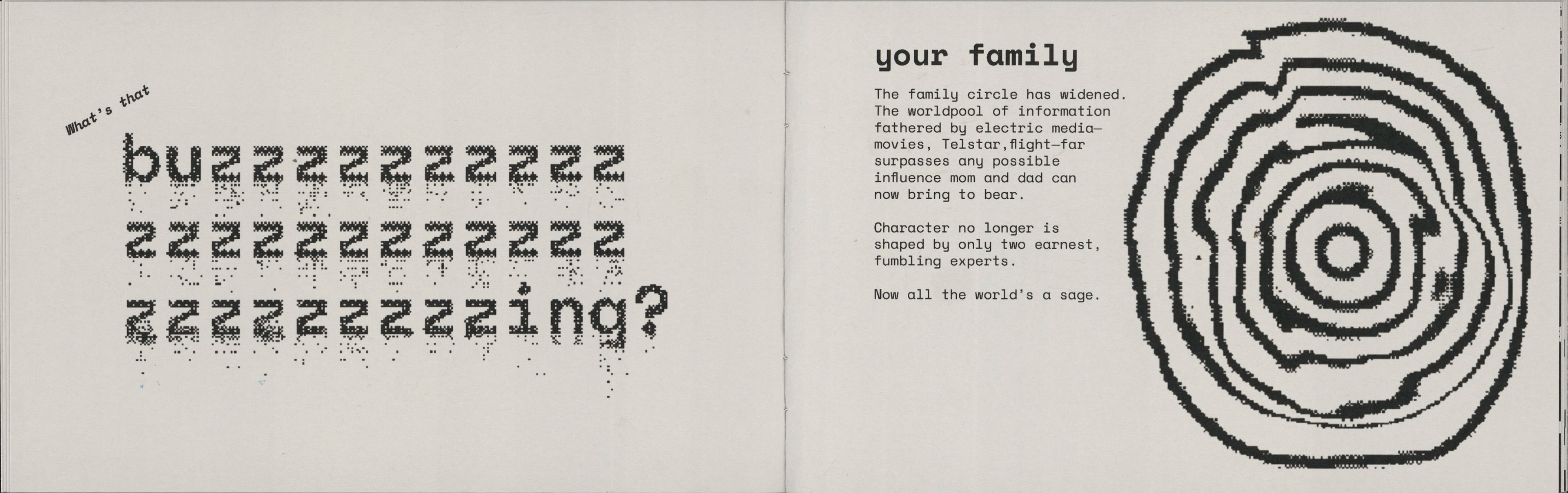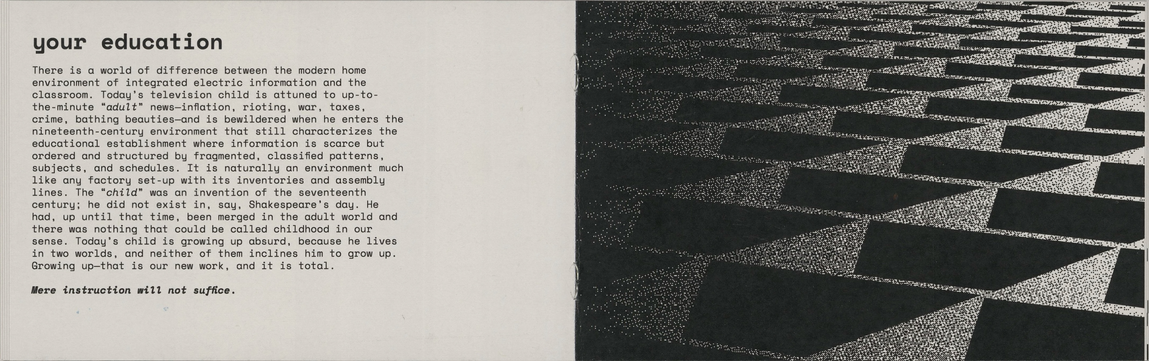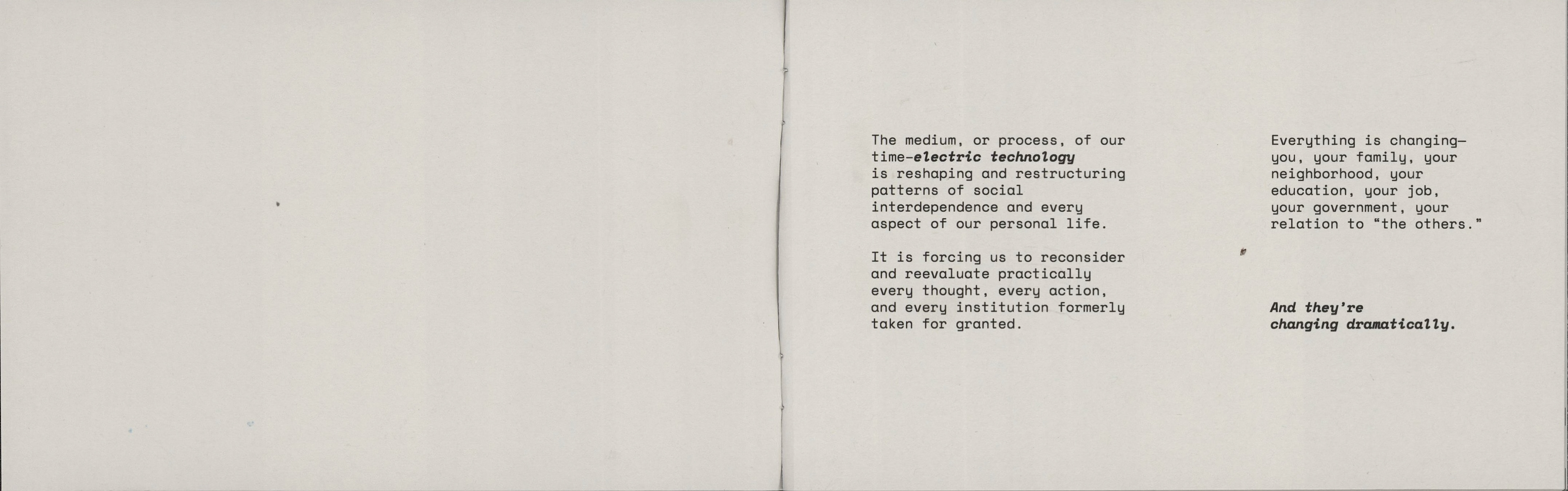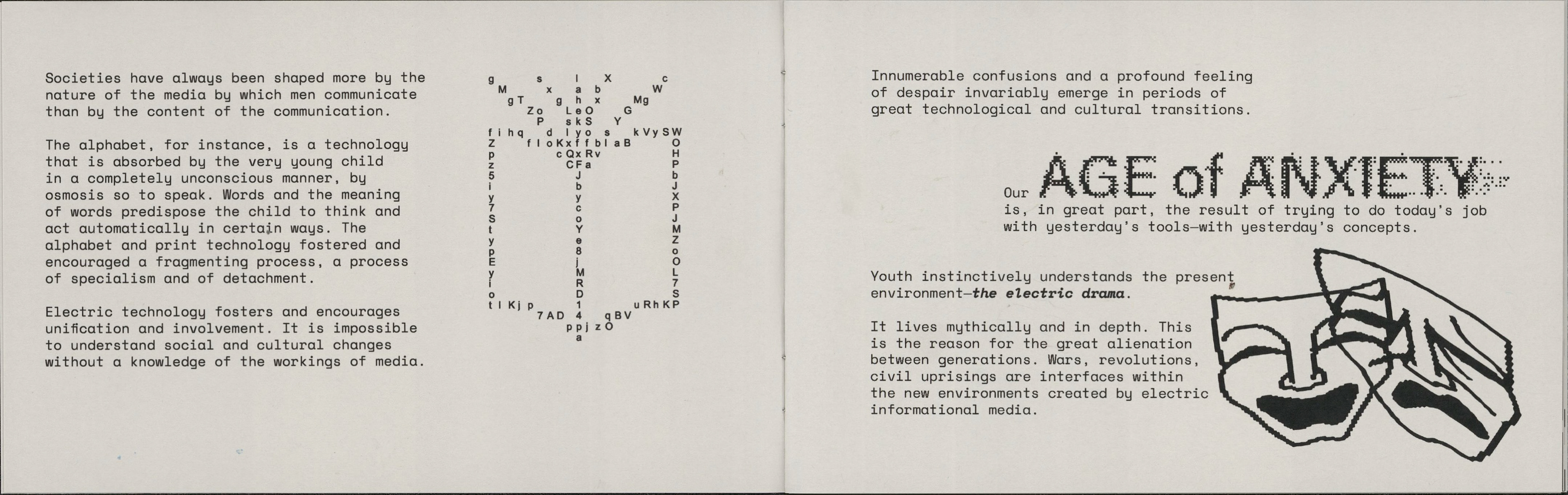 This project involved republishing excerpts of media analyst Marshall Mcluhan's seminal text "The Medium Is The Massage" in a contemporary, short form publication to be distributed to a new audience. The forced pixelation and screen-like format point to the technological changes that have occurred since the original work's release.