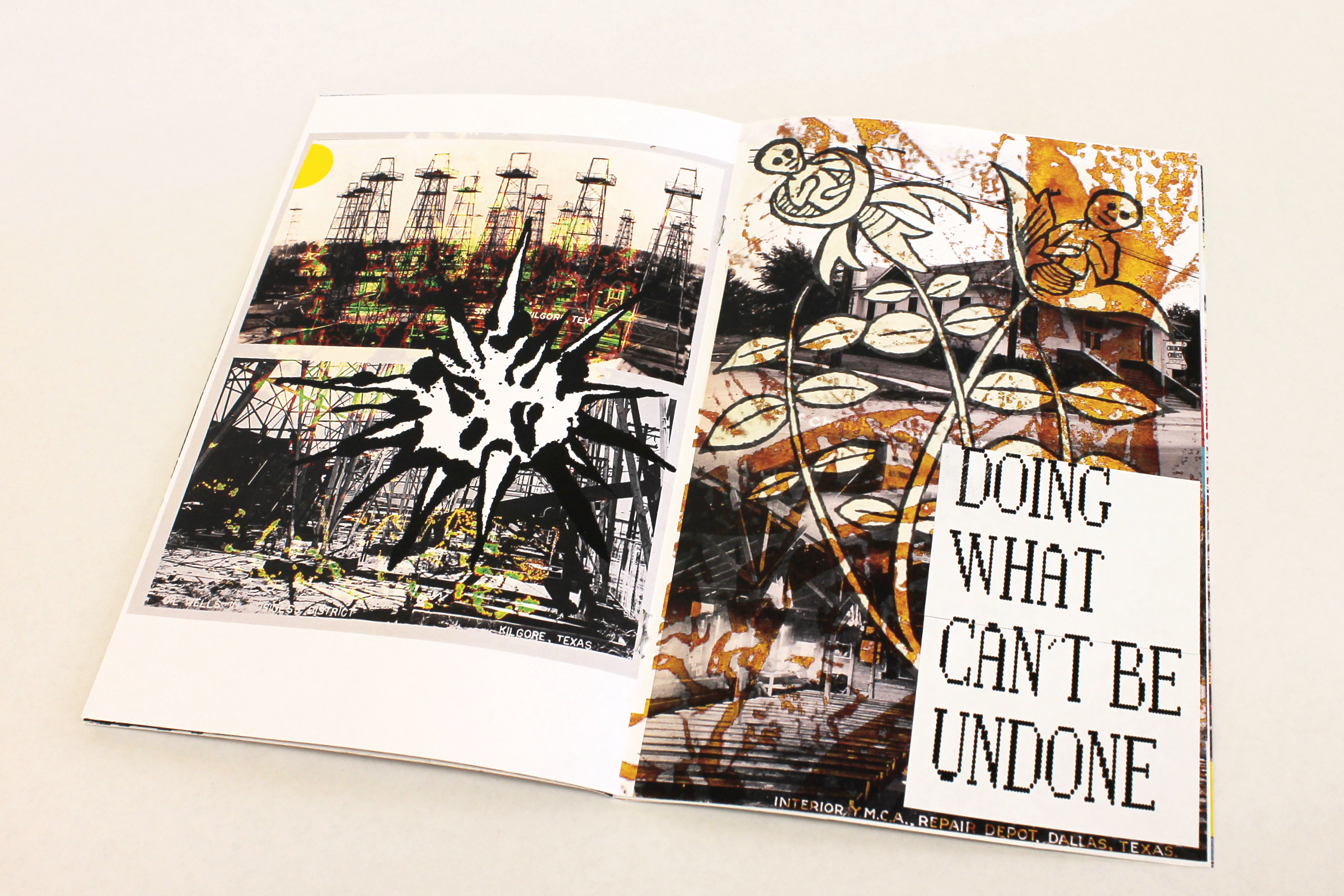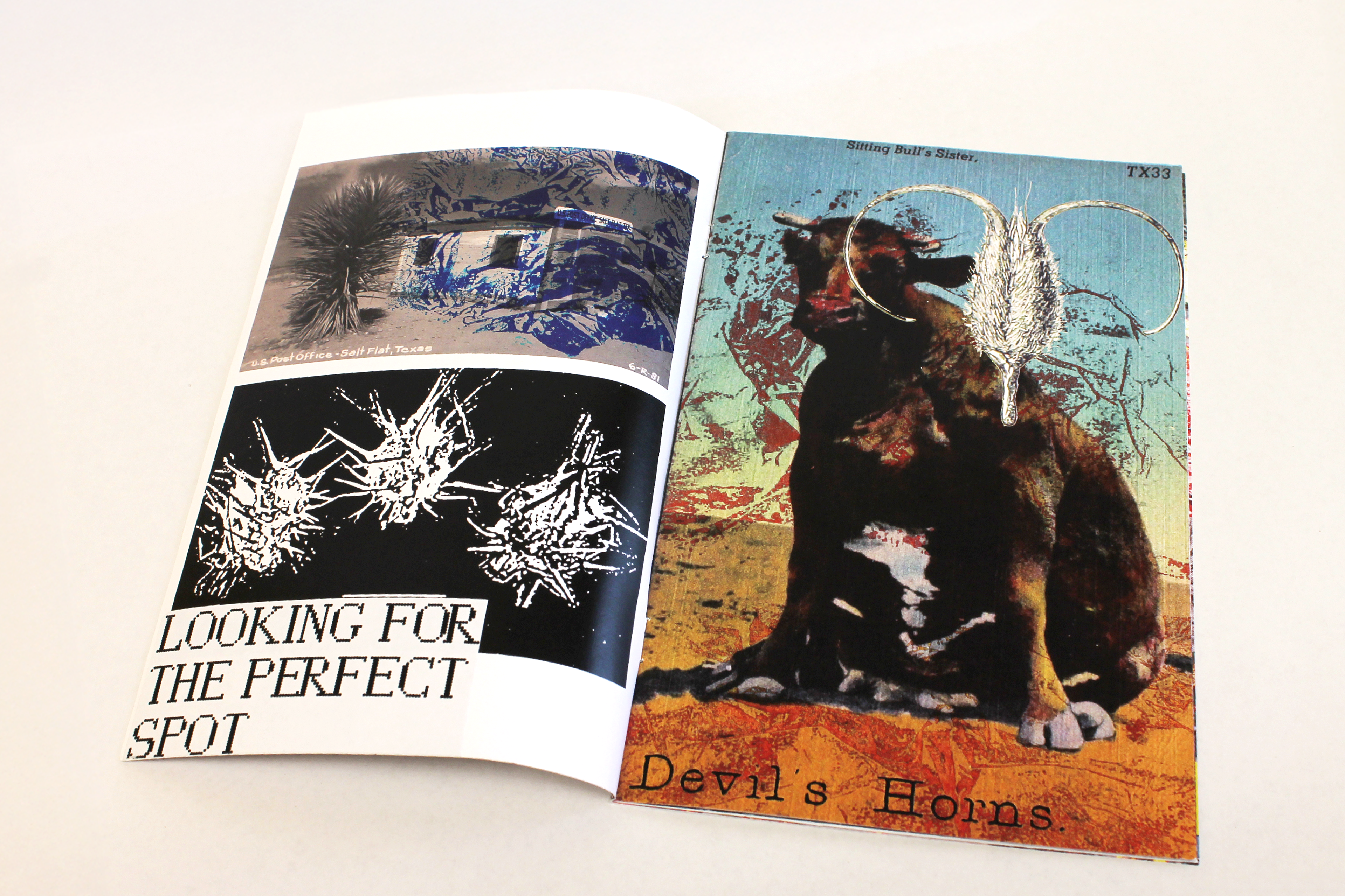 Stuck was an examination of how personal possessions can tell stories about a person's identity and character. I worked with a vintage sticker of the state of Texas to consider the mythology ascribed to the places we are from, as well as the formal quality of stickers themselves and the preciousness that goes into a medium that can only be applied to a surface once. This short zine is completely image-based, and is made up of collaged postcards and illustrations with all text and graphic elements printed onto stickers that can only be formatted once.