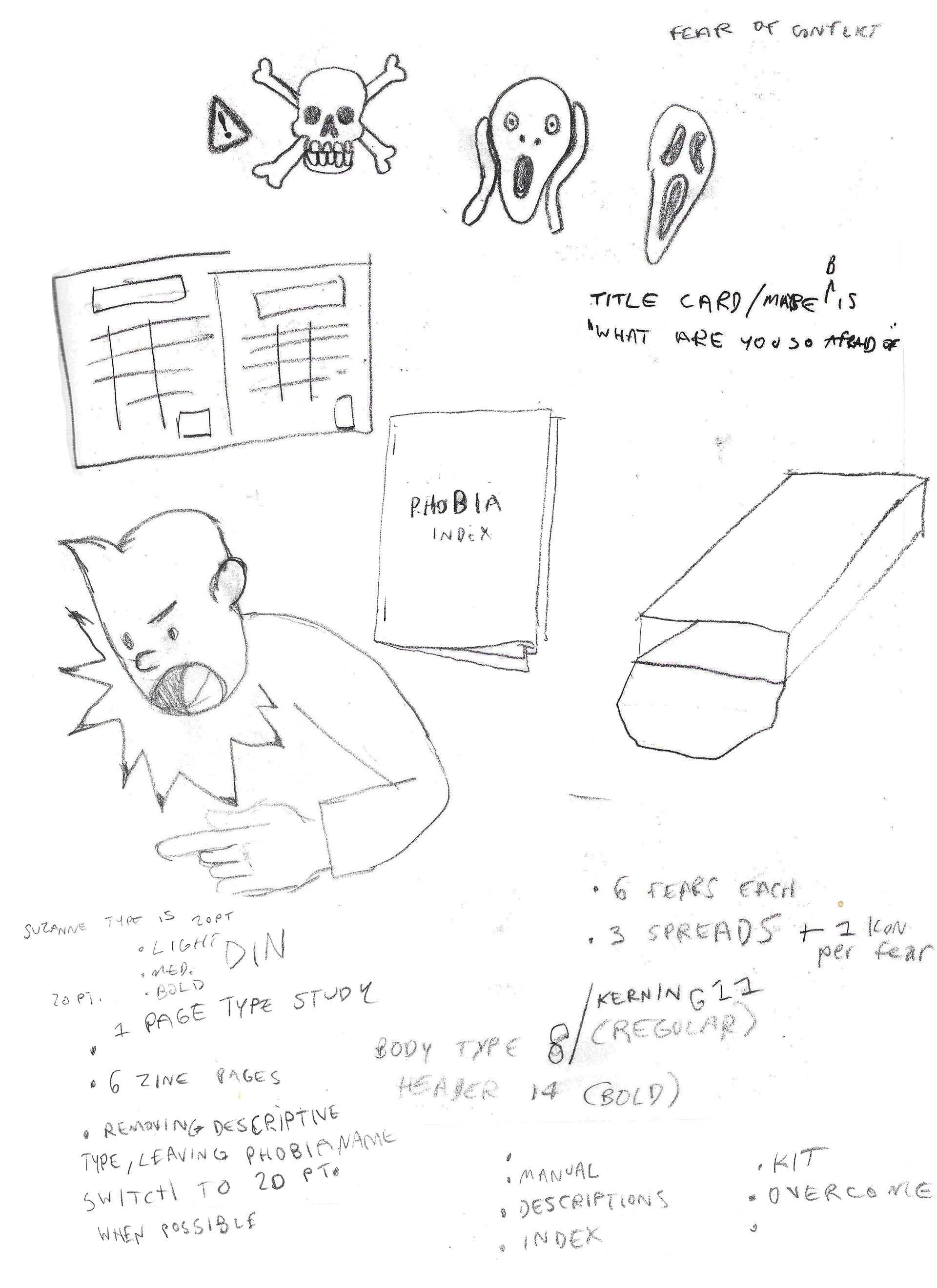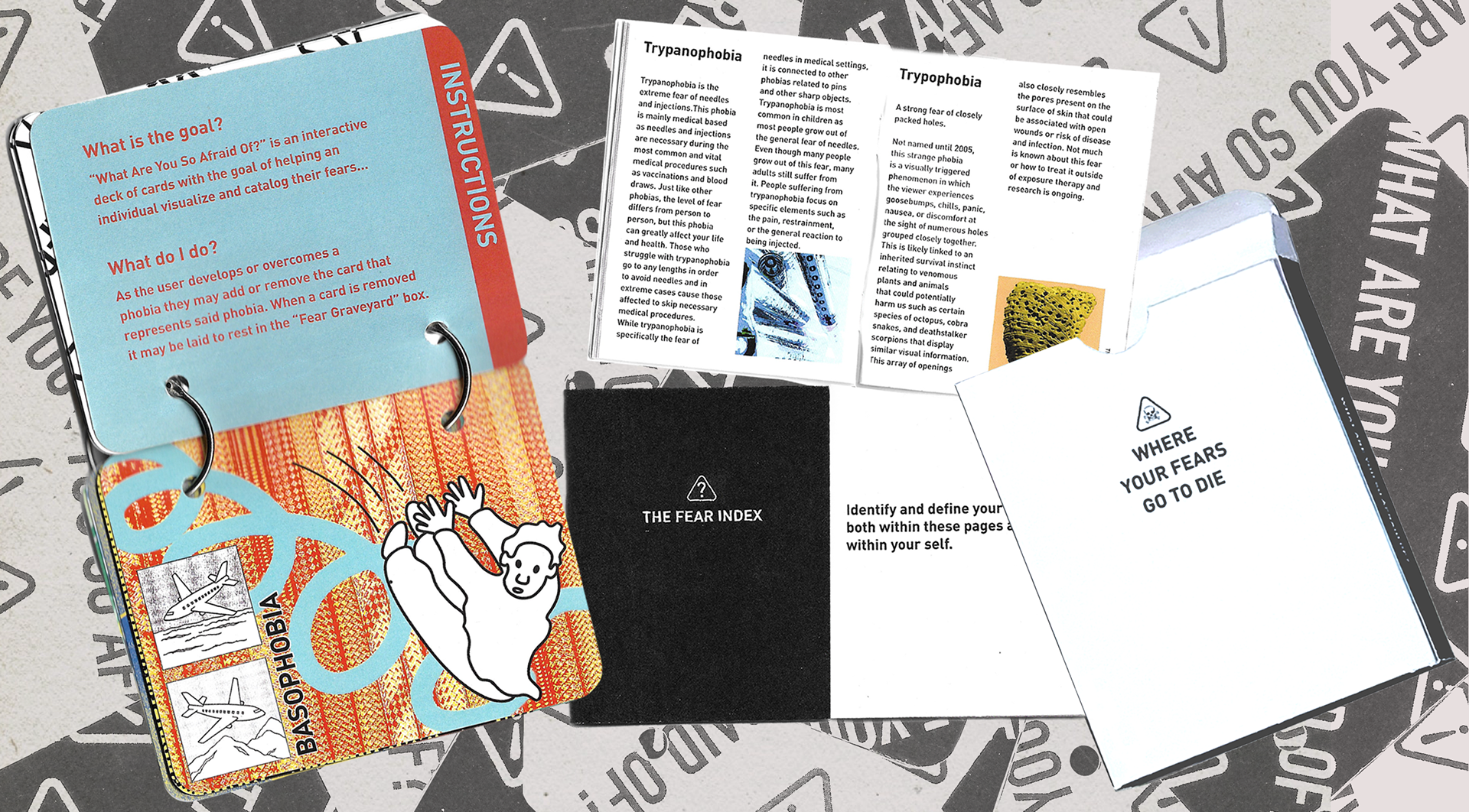 "The Fear Index" is an experimental publication in the form of a set of cards, a traditional index, and a carrying box. This project was the result of a collaboration between myself and three other designers, in which we worked together to create a visual system to depict and catalog a series of fears and phobias, with the goal of allowing the reader to edit and take ownership of their own personal collection of fears and confront the space they inhabit in the subconscious.